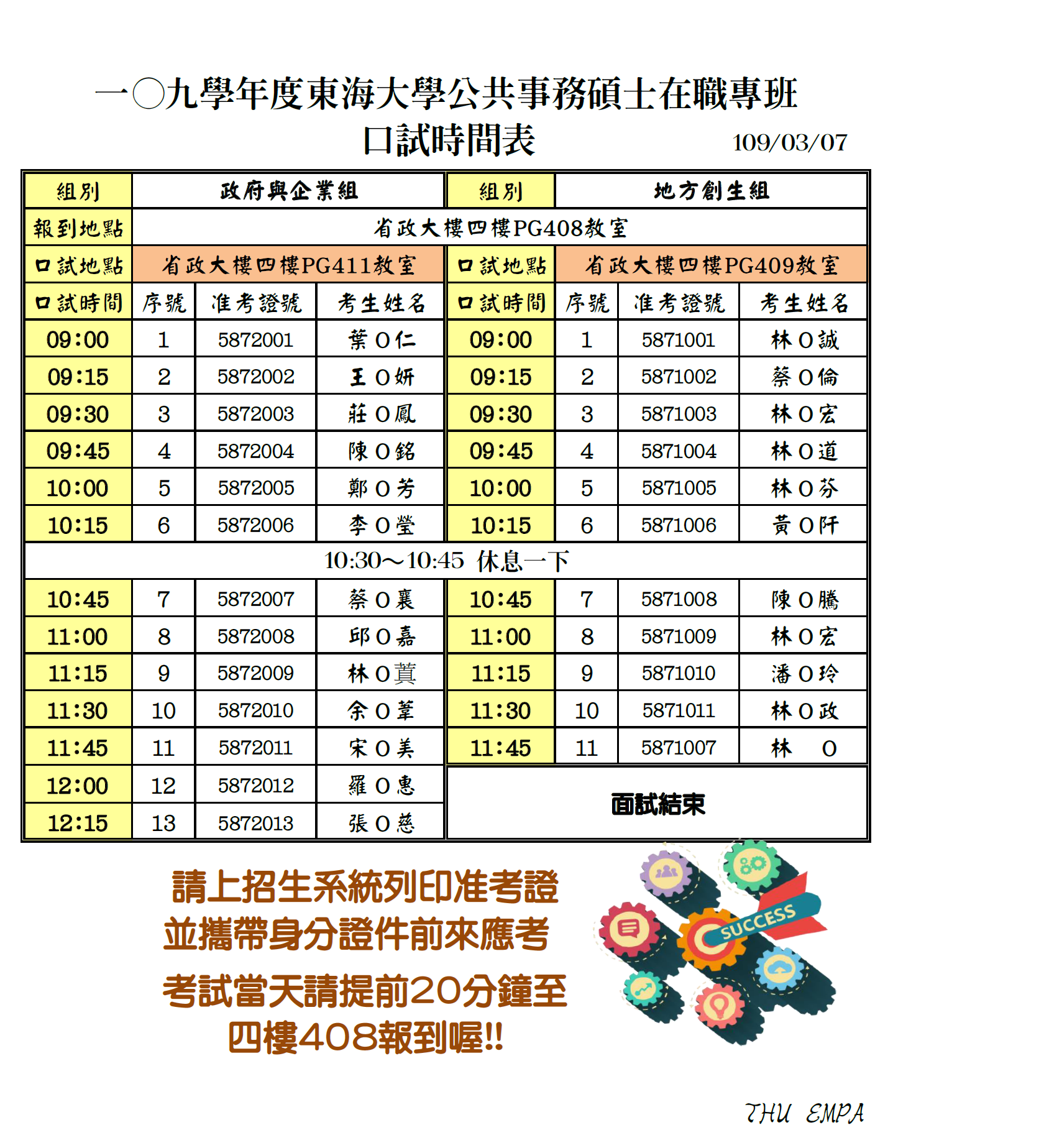 一○九學年度招生考試面試時間表與注意事項