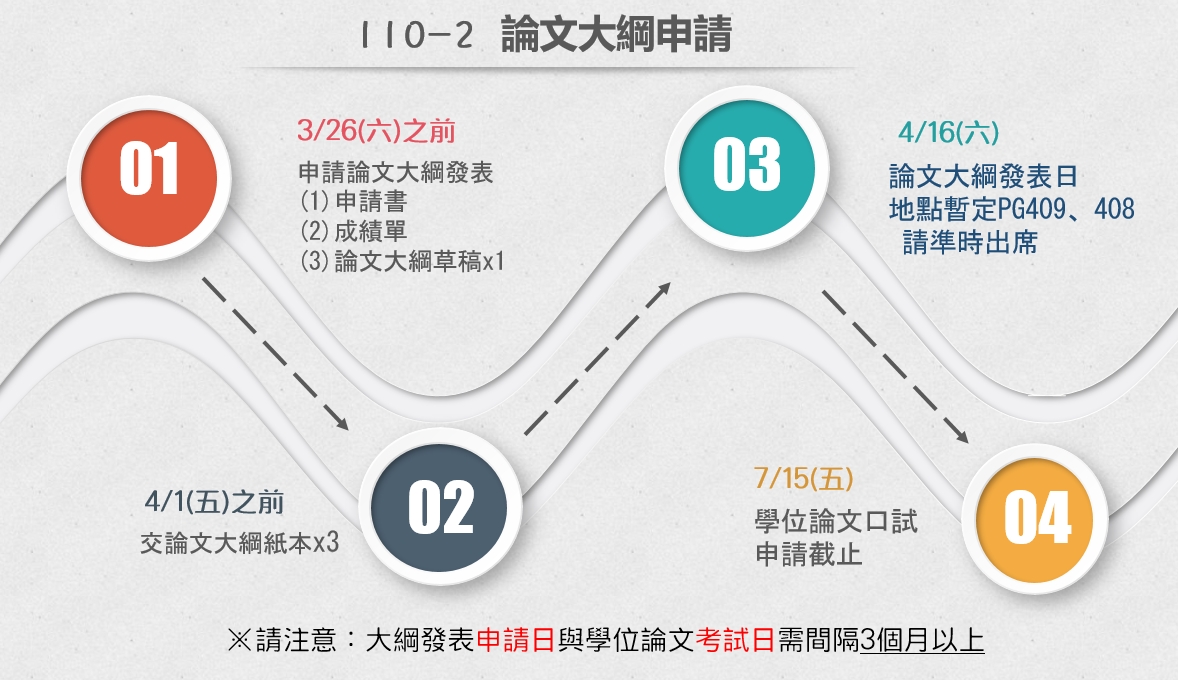 ※敬請注意:提交論文大綱發表申請書日期,須與學位口試舉行日期間隔3個月以上。