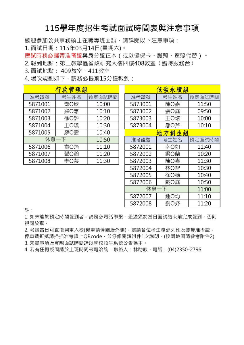 115學年度招生考試面試時間表與注意事項